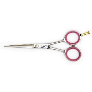 TRI Dimension Slim 5" is a classic straight scissors with flat tension screw and pink finger rings.