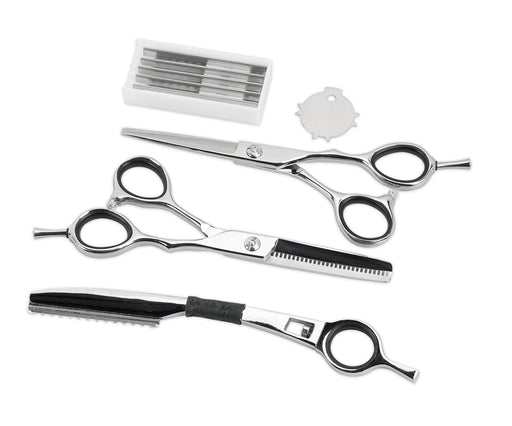 Set including 1 ergonomic scissors 5.5” with micro serrated blades and removable finger rest, 1 ergonomic thinning scissors 5.5” with 28 teethand r...
