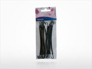 Black hair friendly elastic bands which are tied around the hair and fastened with a hook. Bag of 12.